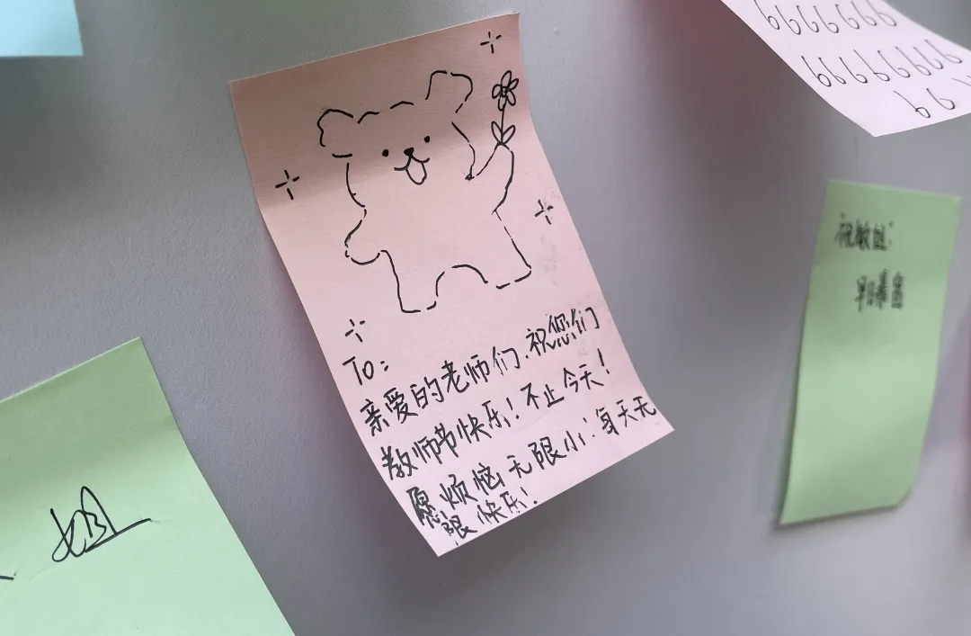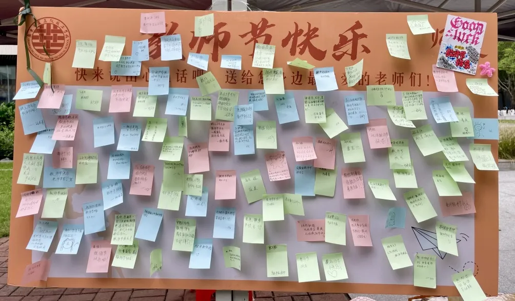 同学们设置了“教师节祝福板”,学生把对老师的感恩话语、美好祝福或难忘过往写在便签上,贴到KT板拼成“祝福拼图”,还有绘画、涂鸦装饰,让祝福板成为传递师恩温情与青春创意的温馨角落。