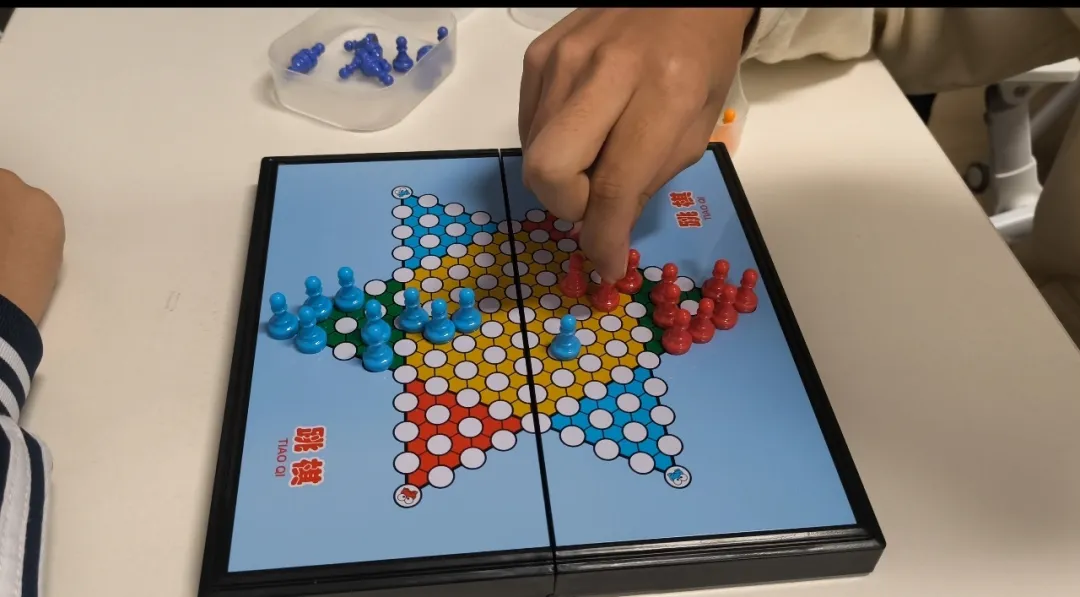彩子跃格连一线,指尖弈出巧思局。跳越牵绊赴终点,方寸棋盘藏智趣。跃格连珠破迷局,指尖博弈见巧思。暗格藏兵布险阵,军旗矗立牵全局,攻防博弈间施巧计,一举夺营定输赢,方寸棋盘演尽烽烟智慧。步步为营设陷阱,狭路相逢勇者胜,军旗不倒便战意难消。黑白子落纹枰间,斜直连珠藏巧思,步步筹谋追先手,五子成线定乾坤,方寸棋盘演尽博弈智慧。先手抢势后手破,五子连心分胜负,简单棋局藏深谋远虑。