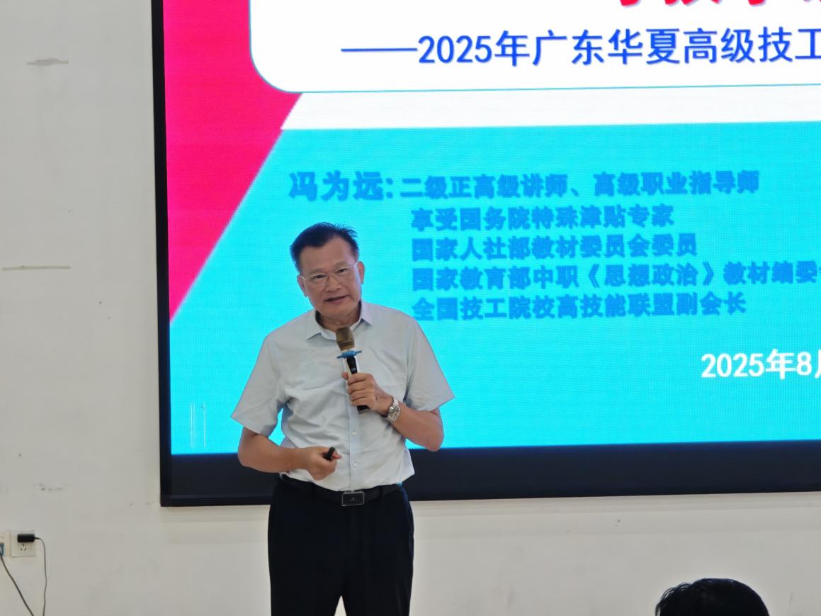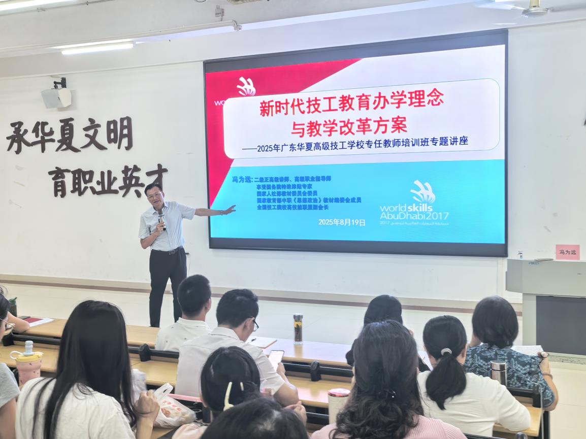 8 月 19 日上午,教师培训在实训 2 栋 103 拉开帷幕。冯顾问以“新时代技工教育办学理念与学校创新教学管理改革” 为主题展开专题分享。他结合当前技工教育发展的政策背景与行业趋势,深入剖析了新时代技工教育的办学定位,详细解读了学校教学管理改革的具体路径与实施重点,为教师们清晰勾勒出技工教育的发展蓝图。