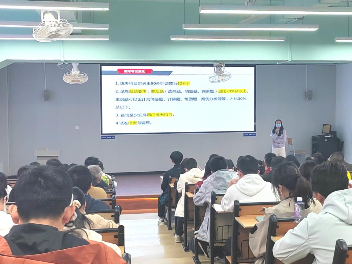 会上,尹老师围绕期末考试工作流程、工作要求及突发情况应对三大关键维度,对本学期期末考试各项工作进行了全面、细致的部署安排。尹老师在工作流程方面,着重强调各项工作的时间节点;在工作要求方面,着重要求评分细则须详细清晰,试卷审核和装袋须认真细致;在突发情况应对方面,主要介绍了应对措施。
