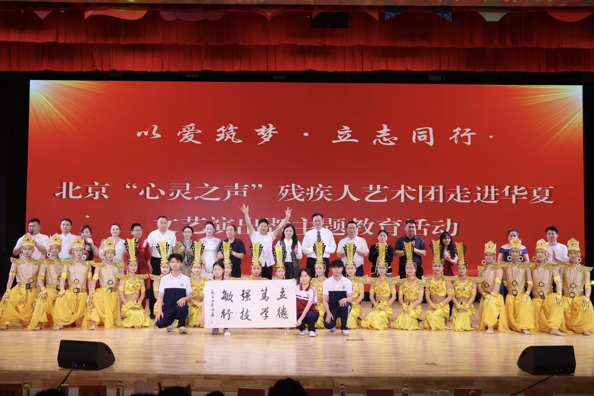 2026年3月28日,广东华夏高级技工学校图书馆报告厅内暖意融融、掌声雷鸣,北京“心灵之声”残疾人艺术团 带着满满的正能量如约而至,一场以“以爱筑梦・立志同行” 为主题的文艺演出暨励志感恩教育活动温情上演。校领导、中层干部、学管人员、班主任代表、学生代表及家长代表共 570余人齐聚现场,共赴这场兼具艺术之美与精神之力的视听盛宴,接受一次直击心灵的精神洗礼。