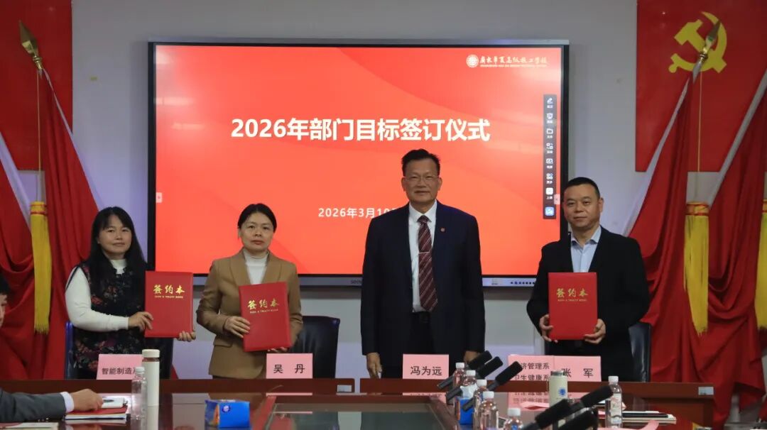 3月10日上午,广东华夏高级技工学校2026年部门目标签订仪式在207会议室举行。学校顾问冯为远、校领导班子成员、各职能部门及系部院负责人等30余人齐聚一堂,共同见证新一年度目标责任与安全管理责任的落实部署。