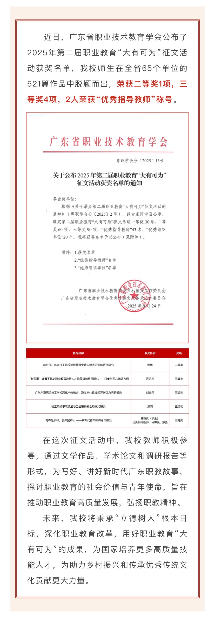 喜报 !我校师生在2025年第二届职业教育“大有可为”征文活动中荣获佳绩