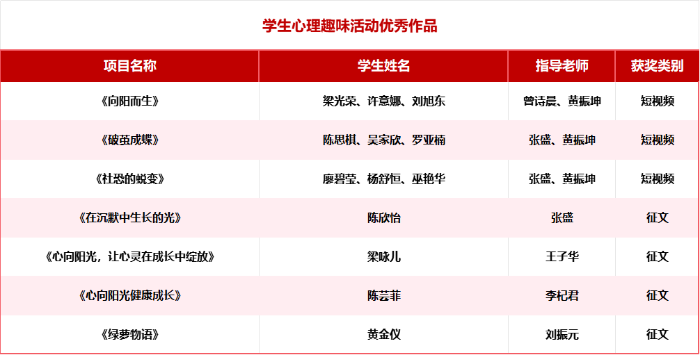 学生作品方面,我校学子共有短视频作品3个、征文作品4个获评“学生心理趣味活动优秀作品”。这些作品形式新颖、内容生动,充分展现了我校学生积极向上的精神风貌和关注心理健康的良好意识。